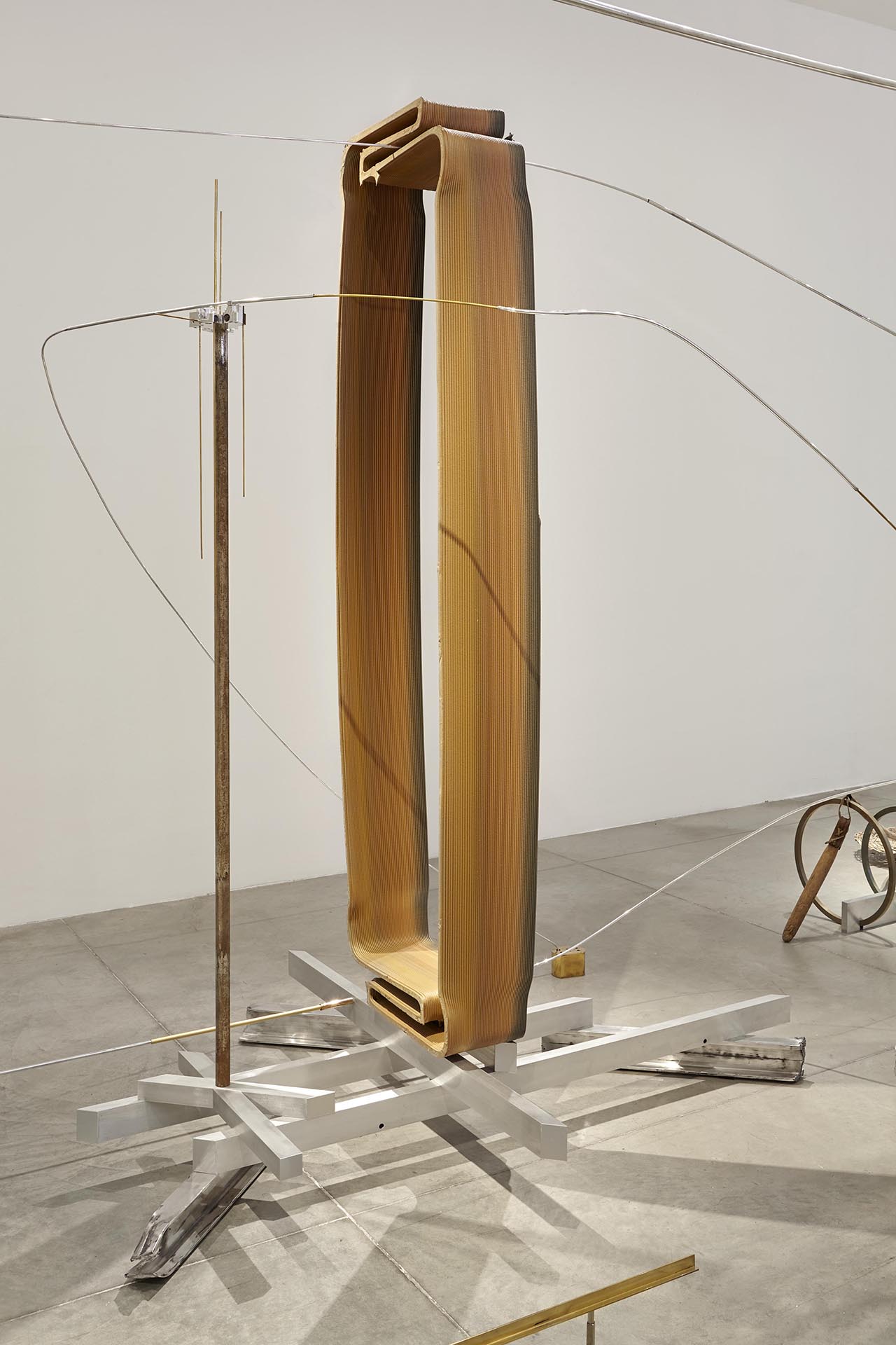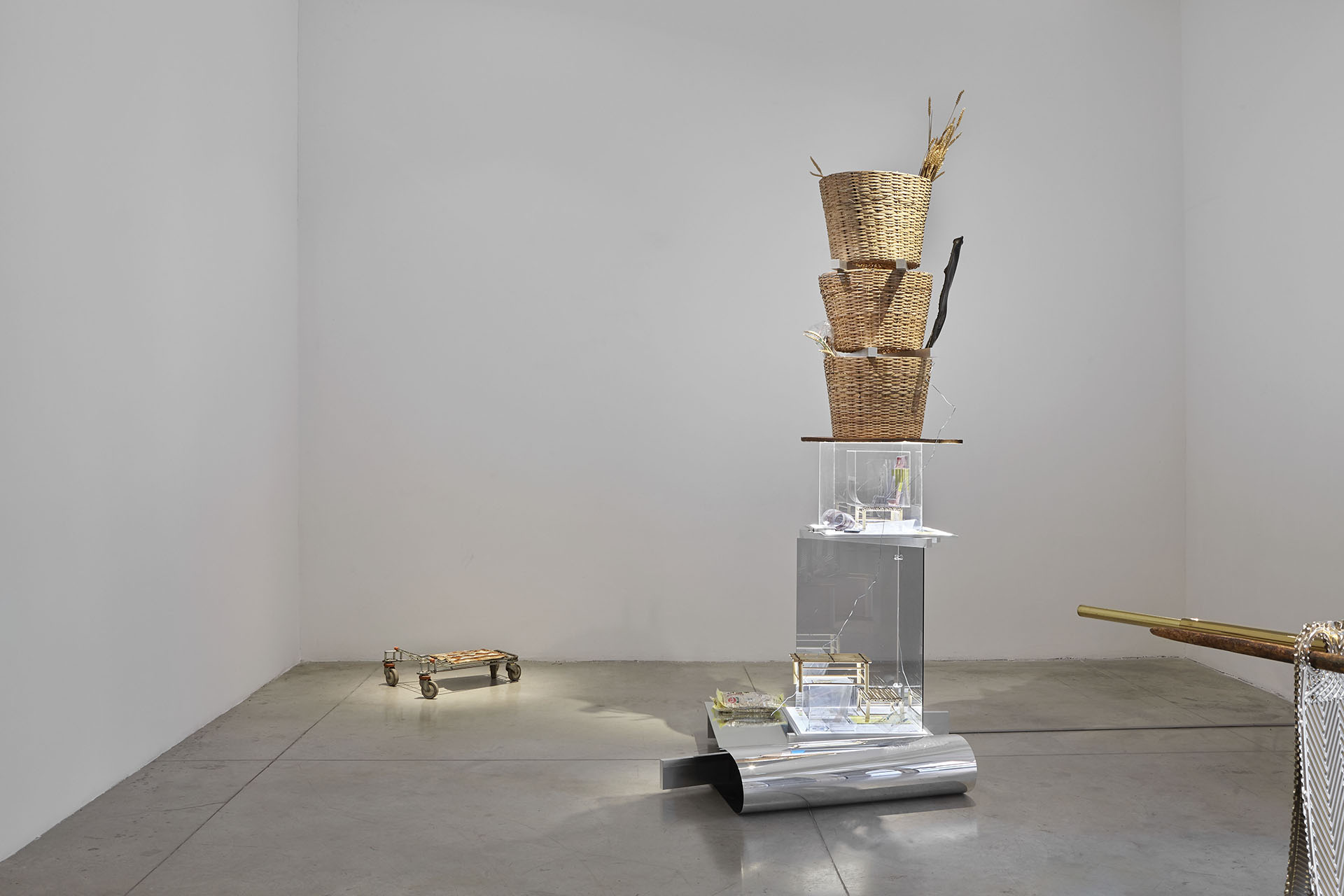 David Jablonowski, Prediction Tower, Taobao Village, 2015, aluminum, glass, transparencies, mirrors, reed baskets, dried rye, offset printing sheet, plexiglass, dried leaves and acrylate, carbon fibre, bamboo, LED-light panels, cm 280 x 120 x 150 approx