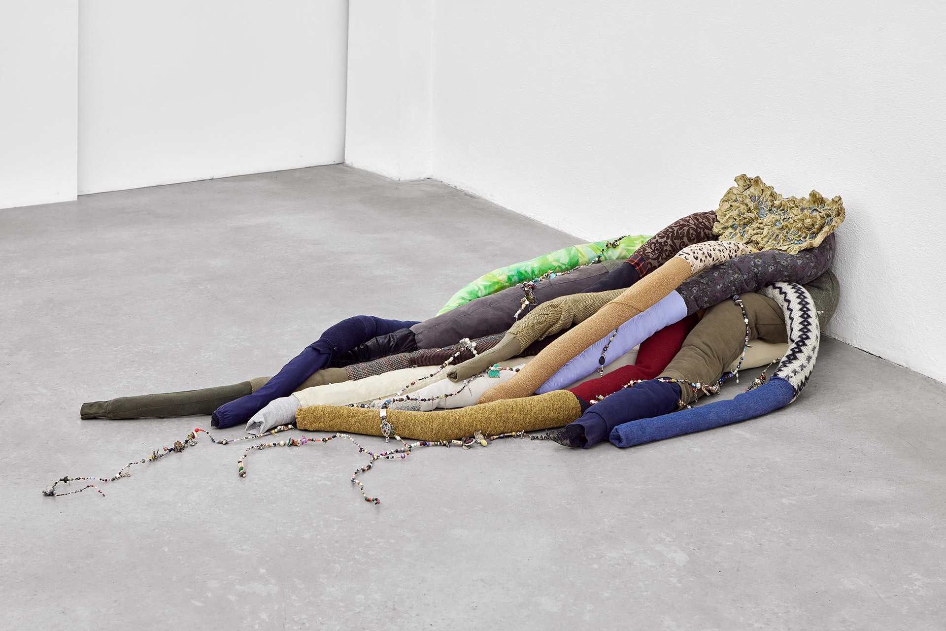 Chiara Camoni, , Medusa, 2024, stoneware glazed with vegetal ash and various minerals, fabrics, custom jewelry, cm 45 x 210 x 85 (variable dimensions)